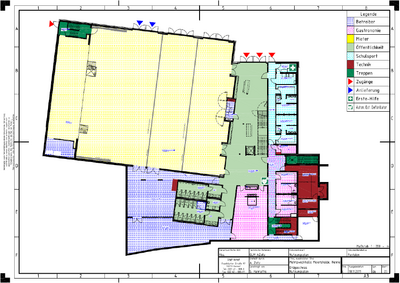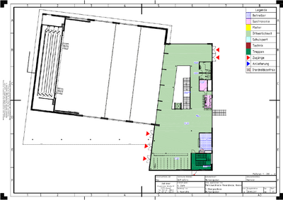 Großes Foyer über zwei Stockwerke (Eingang oben, Halle unten) barrierefrei durch Aufzug. Pressebereich wäre im hinteren Foyer durch Raumteiler abgrenzbar. Eigener Trakt mit Umkleidekabinen auf der selben Ebene wie die Halle, der sich als Wahl-Straße nutzen ließe.
