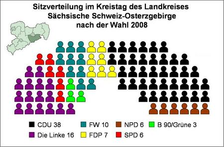 PolitikLandratBei der sächsischen Kommunalwahl am 8. Juni 2008 konnte sich der bisherige Landrat des ehemaligen Landkreises Sächsische Schweiz, Michael Geisler (CDU) im ersten Wahlgang mit 52,4 % der Stimmen gegen fünf weitere Bewerber durchsetzen und wurde damit erster Landrat des neu gegründeten Kreises. KreistagIm neuen Kreistag ist die CDU mit 38 Sitzen die deutlich stärkste Kraft vor der Linken mit 16 Sitzen. SPD und Bündnis 90/Die Grünen haben sich zu einer gemeinsamen Fraktion SPD/Grüne zusammengeschlossen. { |