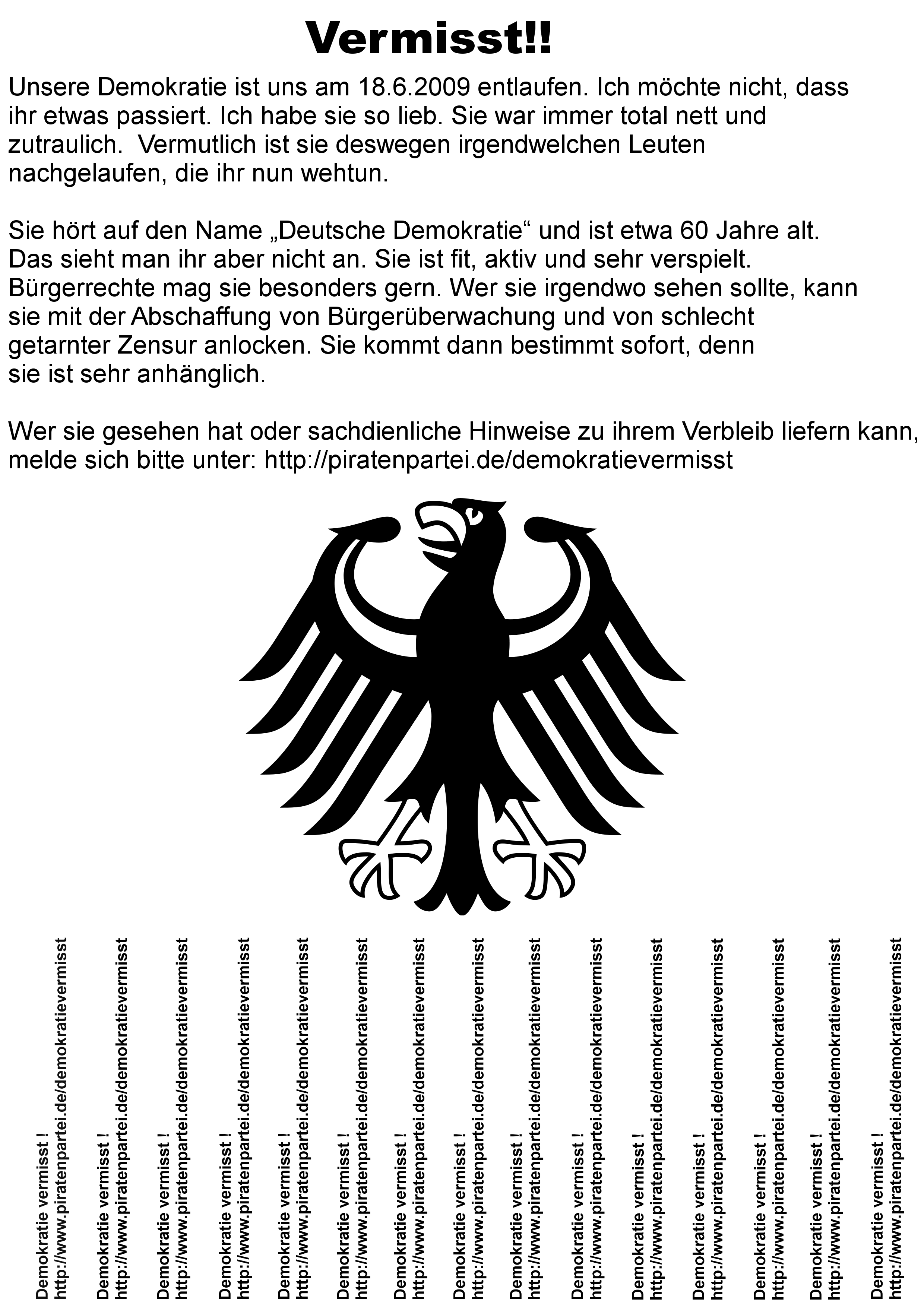 - (Herunterladen) Demokratievermisst.jpg . . 2.480 × 3.508 . . 1,53 MB . . Maintenance script . . 21:56, 19. Jul. 2025